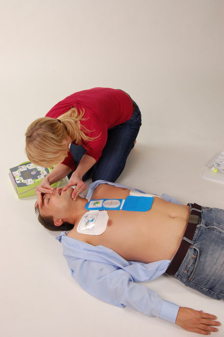 Steht ein Defibrillationsgerät (AED) zur Verfügung, holen Sie es oder lassen Sie es holen und setzen Sie es ein. Folgen Sie in diesem Fall den Sprachanweisungen des Gerätes.